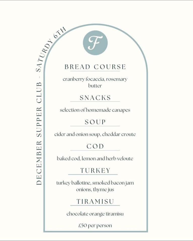 The Supper Club menu is £50 per person and arrival is at 7:00pm for a 7:30pm first course start. Each month the menus and dates can be found here.